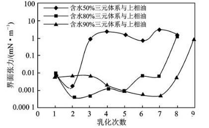 界面张力的高低反应体系启动剩余油的能力,分析含水不同的三元体系多次乳化后与原油间的界面张力见图1。