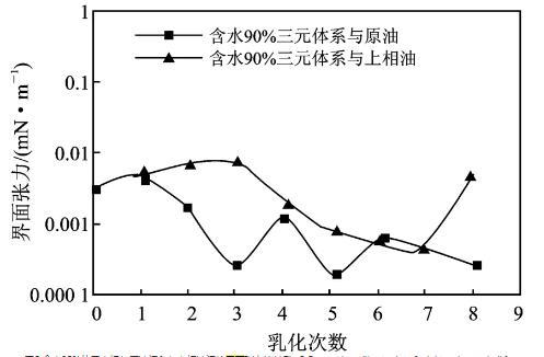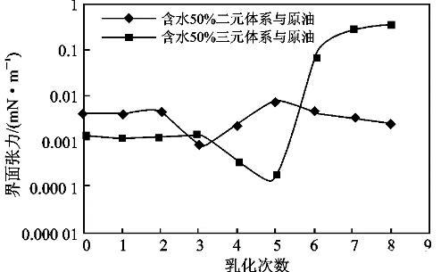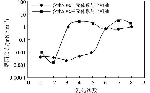 从总体上看,水相与原油间的界面张力低于其与上相油间的界面张力,在乳化第6次以后两者开始趋同。说明乳化会导致油相中的组成发生变化,进而导致油相性质发生变化。因此在复合驱驱替的适当时机应对驱油体系的配方进行相应调整。