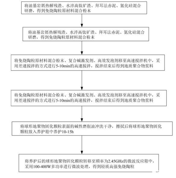 S6将养护后的球形地聚物固化颗粒转移至频率为2.45GHz的微波反应箱中,采用100-400W多功率进行微波处理,得到轻质高强免烧陶粒;步骤S6中,微波快速硬化处理具体包括:首先采用300-400W的功率对球形地聚物固化颗粒微波处理2-3min;然后采用140-200W的功率对球形地聚物固化颗粒微波处理5-10min,得到轻质高强免烧陶粒。