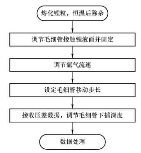 被测材料为锂粒,纯度为99.974%,总金属杂质为260×10-6。鼓泡所用气体为高纯氩气,纯度≥99.999%,符合GB/T 4842—2017标准。为避免高温环境下杂质对实验结果的影响,将实验台架放置在充氩气环境的手套箱内,箱内压力为+200~400Pa,氧含量小于0.5×10-6,水含量小于0.2×10-6。实验基本流程如图3所示。