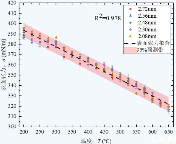 上图6给出了温度T在200~650℃范围内,使用不同管径毛细管测量的液态锂表面实验值及其拟合曲线。可知,拟合结果具有良好线性度。各个温度点的密度实验结果偏差小于±5 mN/m,相对误差为±1.4%,且实验结果均在线性拟合95%预测带中,说明实验结果具有较好可信度。